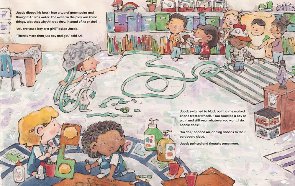 Fans of the series will see familiar faces like Jacob, Sophie, and Ms. Reeves, but in Jacob’s School Play we meet a new character named Ari, who uses they/them pronouns. Throughout the book, you present identity in such a beautifully simple way, with an emphasis on trusting people’s ability to correctly identify themselves. What was the research process like for Jacob’s School Play? How did you land on this honest and simple representation of pronoun options?